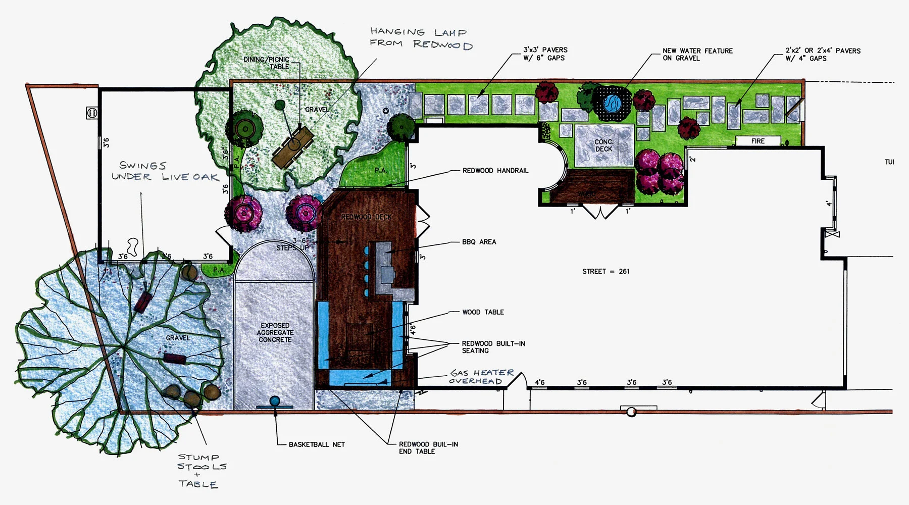 The homeowners loved the natural feel of their property which is on a moderate down sloping lot in Belmont. A large Coast Live Oak at the center of the backyard space provided a beautiful focal point. The main objective for the homeowners was to make the site more useable and safe for their young children to play.